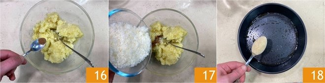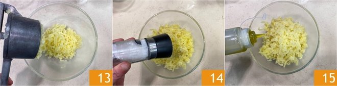 Mash the remaining potatoes while still hot in a bowl 13. Season with salt 14, pepper, and oil 15.