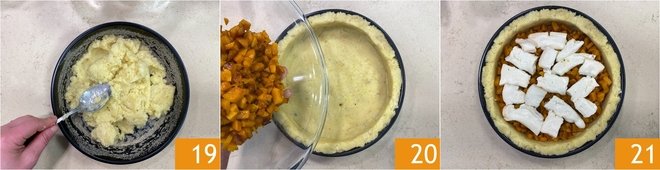 Transfer the potato puree inside 19 and press with the back of a spoon to cover both the base and the sides of the mold. Pour the pumpkin cubes into the center 20 and place the taleggio slices on top 21.