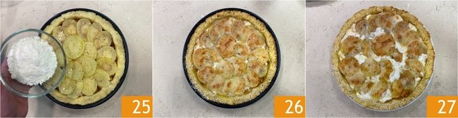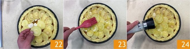 Cover with the boiled potato slices 22 and oil the surface 23. Season with salt 24 and pepper.