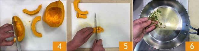 Cut the pumpkin first into slices 4 and then into small cubes 5, you will get about 14 oz. In a pan, pour a swirl of olive oil, a clove of garlic, and sprigs of thyme 6, and let it flavor for 1-2 minutes.