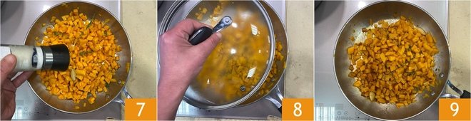 Now add the pumpkin cubes and season with salt 7 and pepper. Cover with a lid 8 and cook for about 10 minutes over medium heat; if it dries out too much, add a little water. When the cubes are soft enough to be pierced with a fork, turn off the heat 9.