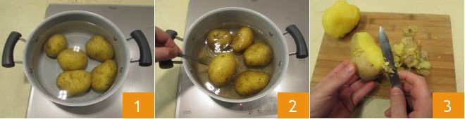 To prepare the potato gateau with salami, start by boiling the potatoes: rinse them and place them in a large pot, covering them with plenty of cold water 1. Put the pot on the stove, and as soon as the water reaches a boil, count about 30-40 minutes, depending on the size of the potatoes. Do the fork test to ensure they are cooked 2: if the tines easily reach the center of the tubers, then they are ready. Drain the potatoes and start peeling them while they are still hot, using a small knife to avoid burning yourself 3.