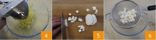 Finally, mash them immediately in a bowl: when hot, the potatoes will break down more easily and won't form lumps 4. Meanwhile, cut the mozzarella into cubes 5 and place it in a strainer to squeeze it, removing excess whey 6. Alternatively, you can squeeze it using a clean cloth.