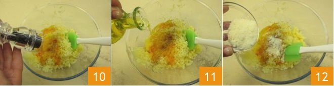 Also add a sprinkle of pepper 10, salt, a drizzle of oil 11, and the grated Parmigiano 12.