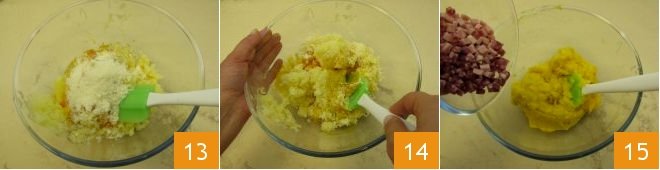 Cut the Napoli-style salami into cubes of about 0.4 inches 7, then do the same with the slice of cooked ham 8. At this point, take the mashed potatoes and add the eggs 9.