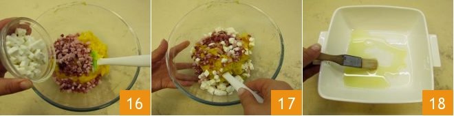 Also pour the drained mozzarella into the bowl 16 and mix everything together 17. At this point, oil an 8x8 inch square baking dish 18.