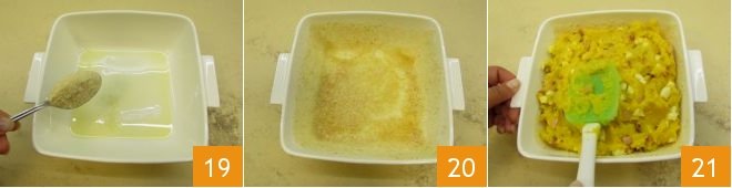Sprinkle the inside with breadcrumbs 19, shaking the pan to ensure it covers the entire surface 20. Pour the mixture into the pan, using a spatula to level it 21.