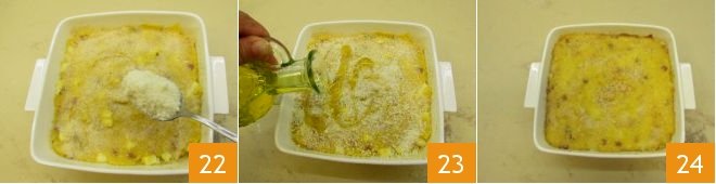 Sprinkle the surface with breadcrumbs and Parmigiano 22, drizzle again with oil 23, and bake in a preheated static oven at 356°F for about 30 minutes. When a golden crust has formed, your potato gateau with salami is ready to be served 24!