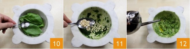 At this point, proceed to prepare the Genoese pesto (Pesto alla genovese). Take the basil and clean the leaves, then put them in a mortar. Now take the garlic, peel it, and add it to the mortar with a few grains of coarse salt 10. Crush the basil leaves until a bright green liquid comes out. Then add the pine nuts 11 and, while mixing, also add the grated Parmesan and Pecorino cheese. Finally, add the oil slowly while continuing to mix with the pestle 12. When you have obtained a creamy and homogeneous sauce, your pesto will be ready. If you don't have a mortar, you can use a blender, making sure to chill the blender cup in the refrigerator at least an hour before to cool it and be careful to turn on the blender intermittently so that the blades do not overheat.