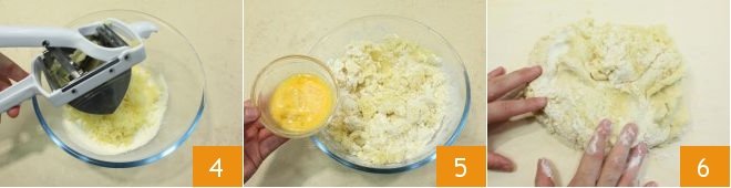 Now, using a potato masher, mash the potatoes into the bowl 4 and begin to knead. Then adjust the salt and add a beaten egg 5. Continue kneading vigorously with your hands until you obtain a homogeneous and soft dough 6.