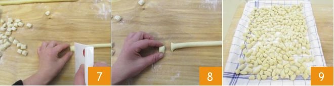 Then, create logs about 0.4 inches thick with the dough 7. Using a dough scraper, cut small pieces about 0.4 inches from each log 8. Repeat the operation for the entire dough. Take a tray, place a clean cloth on it, sprinkle it with semolina, and lay the gnocchi on it gradually 9.