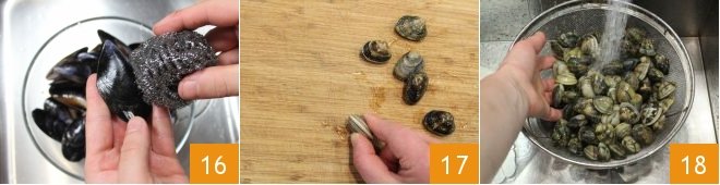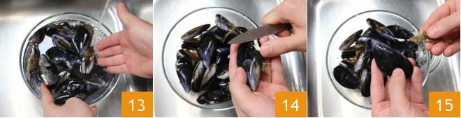 Now proceed with the preparation of the shellfish. Start with the How to Clean and Open Mussels: rinse them under plenty of running water 13. Use a knife to remove encrustations and barnacles 14, then pull away the byssus, the beard you see coming out of the shells 15.