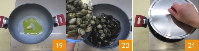Now that the shellfish are clean, take a high-sided non-stick pan. Add a drizzle of oil and brown a garlic clove 19 for flavor. Then add the mussels and clams 20. Cover the pan with a lid and let the mussels and clams open up 21 over a lively flame for a few minutes until the shellfish have opened.