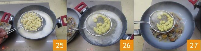 At this point, take a pot with high sides, pour in the water along with the remaining cooking liquid from the shellfish, and bring it to a boil. Add the gnocchi, if you prefer using a slotted spoon 25. When the gnocchi rise to the surface of the water, they are ready, and you can drain them using a slotted spoon 26 to remove the cooking water. Then add them to the pan where you placed the shellfish 27.
