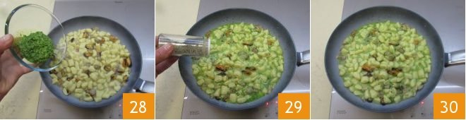 Also add the pesto you set aside to the pan 28, adjust the salt and pepper 29. Over low heat for 2-3 minutes, mix the ingredients well, combining them with the help of a wooden spoon or spatula, and your dish is ready 30. Then decorate the dish with the shellfish with shells you set aside and serve these wonderful potato gnocchi with pesto, mussels, and clams!