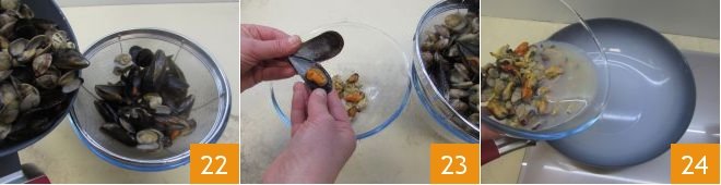 Once opened, drain the shellfish with a colander placed over a bowl to filter the cooking juice 22 and set it aside. Shell the shellfish, keeping a few aside for decorating your dish 23. Pour the mussels and clams with a bit of cooking liquid into a non-stick pan 24.