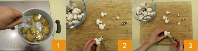 To prepare the potato pie with sausage and mushrooms, start with the potatoes. Immerse them in a large pot full of cold water 1, turn on the stove and from the moment of boiling, wait 30-50 minutes, depending on the size. Always do the fork test: if the prongs go in easily, they are cooked. Meanwhile, take care of the mushrooms: remove the base 2 and clean the stem and cap with a brush or a damp cloth to remove any soil residues 3.