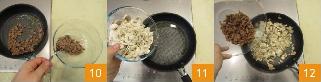 Wait for the alcohol to evaporate before collecting the sausage with a spoon: transfer it to a bowl and set aside temporarily 10. In the cooking base, add another drizzle of oil, then the mushrooms and sauté them for a moment 11. Add a pinch of salt, waiting for the liquids to come out; when they are about to dry up completely, add the sausages to flavor 12.