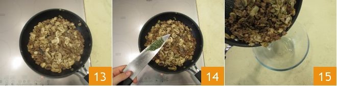 Sauté for another moment to dry the base well 13, then turn off and sprinkle with chopped rosemary 14. Mix and transfer to a bowl 15.