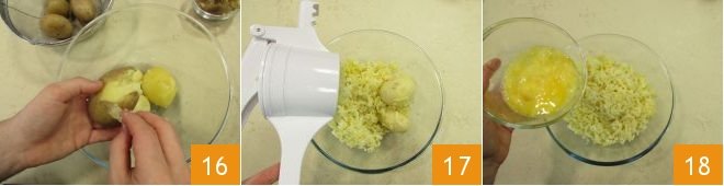 At this point, the potatoes will be cooked: drain them, let them cool for 10 minutes before peeling them, still warm, making it easier to remove the skin 16. Mash them with a potato masher (you can also do it with a fork if you don't have one, but the result will be more granular) 17. Add the eggs 18,