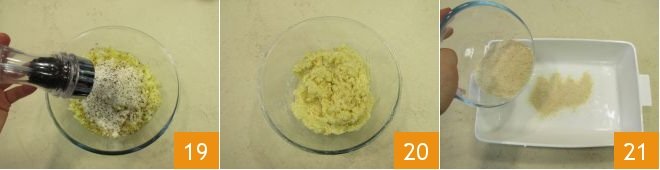 the grated Parmesan, salt, and pepper 19. Knead briefly with your hands 20 and check the consistency of the dough: if too dry, add a little milk; if too soft, add more Parmesan. Proceed to the composition. Butter and sprinkle with breadcrumbs a 12x8 inch baking dish 21