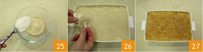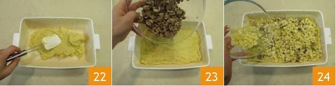 and place half of the dough 22, compact it with wet hands. Then the mushrooms with the sausages 23 and the diced caciocavallo cheese 24.