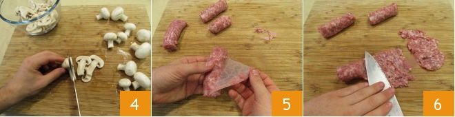 Then slice thinly and set aside 4. Peel the sausages 5 and crush them with the back of the knife 6.