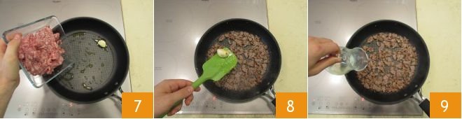 In a pan, pour a little oil along with a garlic clove, add the crumbled sausage and sauté for a few minutes 7. When the meat is well browned, remove the garlic 8 and deglaze with white wine 9.