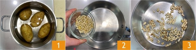 To make the potato salad with chicory and feta, first cook the potatoes starting from cold water for about 30–40 minutes, until they are soft enough to be pierced with a fork 1. Meanwhile, place the pine nuts in a skillet 2 and toast them for a couple of minutes 3, then set them aside.