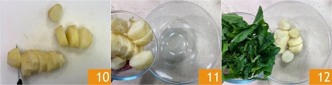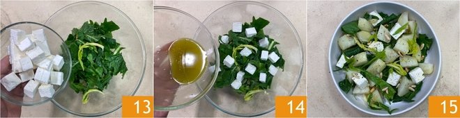 When the potatoes have cooled, peel them and cut them into cubes about 1 1/4–1 1/2 inches 10. Transfer the potato cubes to a large bowl 11, then add the chicory that you have drained and patted dry 12.