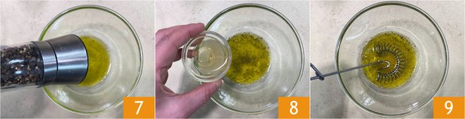 Pour the oil into a small bowl, then add the salt, pepper 7 and the apple cider vinegar 8. Whisk well to emulsify and set aside 9.