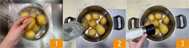 To prepare the potatoes in a pressure cooker (with skin) first wash them well 1. Then transfer them into the 4.5L pressure cooker and add 1 cup of water 2. Also add a pinch of salt 3. It is good that the potatoes do not overlap and remain slightly spaced apart.