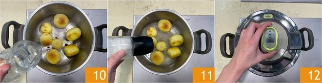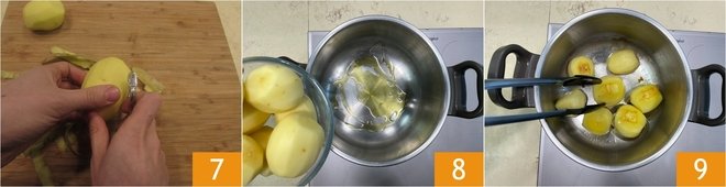 To prepare the potatoes in a pressure cooker (without skin), pour a generous drizzle of oil into the 4.5L pressure cooker and let it heat over medium-low heat. Peel the potatoes 7, pour them into the pressure cooker 8, and brown them well on all sides 9. A few minutes will suffice.