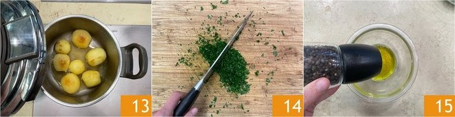 Once cooked, turn off the heat. Lift the valve so that all the steam contained in the pressure cooker is released quickly (do this operation carefully not to burn yourself). As soon as the pot is no longer under pressure and the control valve has dropped, you can open the lid 13 and transfer the potatoes to a container. Take care of the seasoning, first finely chop the parsley 14, then in a small bowl pour the oil, salt, and pepper 15.