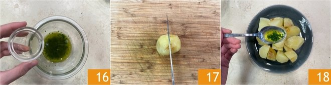Add the parsley, vinegar 16, and mix well. Now take the potatoes and cut them into quarters 17. Transfer them to a plate and season with the prepared emulsion. They are excellent both warm and cold.