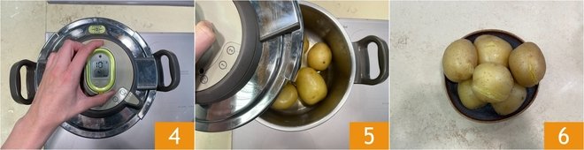Close the pressure cooker well with the lid, close the valve 4, and turn on the heat to medium-high. From the first whistle, indicating that the pot is under pressure, cook them on medium-low heat for 10 minutes. Turn off the heat, lift the valve to release the steam (be careful not to burn yourself). As soon as the pot is no longer under pressure and the control valve has dropped, you can open the lid 5. Remove the potatoes without burning yourself 6 and use them as you like!