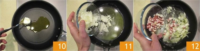 In a pot, pour the oil and about half of the butter 10. Let it melt, then add the onions 11 and cook for a few minutes. Then add the bacon 12