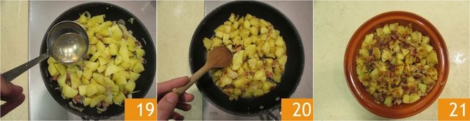 Wash the potatoes well, then put them in a pot and add water to cover them 1. Turn on the heat and let them cook for about 30 minutes. Check the cooking with the tines of a fork; they should be soft but not overcooked. Once cooked, drain them and let them cool slightly. At this point, peel the onion 2, cut it in half first 3