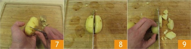 Peel the now warm potatoes 7, cut them in half 8 and then into cubes 9. There’s no need to be very precise.