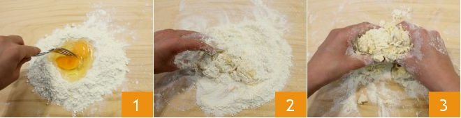 To prepare the pouches with burrata, artichokes, and tomato sauce, start with the fresh pasta: arrange the flour in a fountain on a work surface (you can also pour the ingredients into a bowl to work them), break the eggs in the center and start mixing with a fork 1, then once the eggs are absorbed, proceed by hand kneading energetically 2 3 until you obtain a smooth dough.