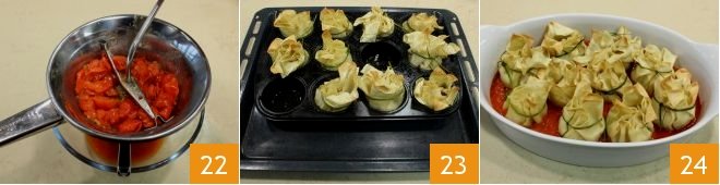 Retrieve the fresh pasta, divide it to pass 100-150 g at a time through the pasta machine (you can also roll it out with a long rolling pin), setting from the lowest to the highest level to obtain a very thin sheet 10. Then cut squares of 5 inches 11 from the rectangles obtained with a pasta cutter: you should get 20. Carefully butter a muffin tin that will be used to cook the pouches 12