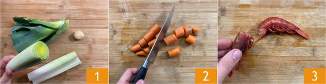 To prepare the prawn and leek risotto, clean the leek by cutting away the green leaves and the base, then peel it to remove the outer layer 1. Wash and keep the scraps. Wash and cut the carrot into pieces 2. Finally, clean the prawns and set aside the shells 3.