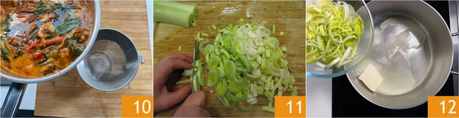 Strain the stock through a sieve 10 and keep it warm. Cut the leek into thin slices 11 and let it braise well in butter 12.