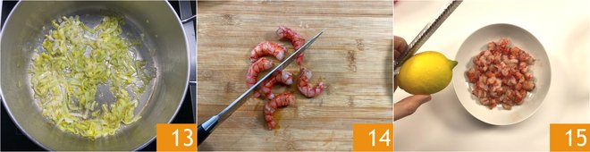 Once golden 13, set it aside. Cut the prawns into pieces 14 and season them with salt and lemon zest 15.