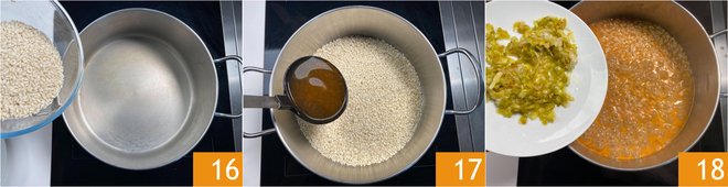 Toast the rice dry 16 and start cooking it by adding the stock little by little as it gets absorbed 17. After about 10 minutes, add the braised leek 18 and finish cooking the rice.