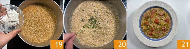 Once the risotto is cooked, stir in the goat ricotta off the heat 19 and scent with marjoram 20. Serve the risotto by adding the prawns to the plates 21.