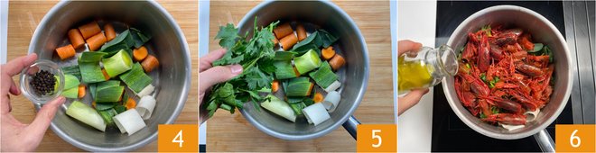 In a saucepan, prepare the stock: add the prawn and leek scraps, the carrot, salt, and pepper 4, a sprig of parsley 5. Also, add the prawn cleaning scraps, a drizzle of oil, and toast everything on high heat 6.