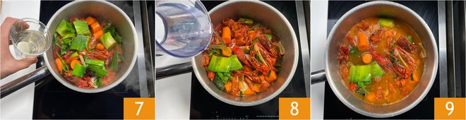 Deglaze with wine 7. Once the alcohol has evaporated, cover with cold water 8 and let it cook for an hour 9.