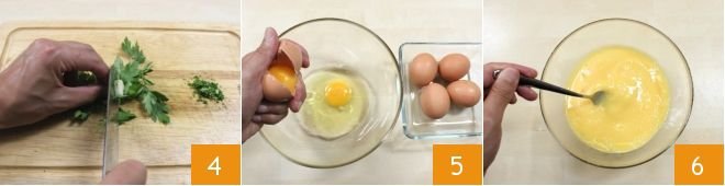 Now wash the parsley stems and pat them dry with a clean kitchen cloth or paper towel, then peel a clove of garlic and clean a shallot. Place them on a cutting board and chop them finely 4. At this point, break the eggs into a bowl 5, beat them with a fork or whisk 6, and add salt and pepper to taste.