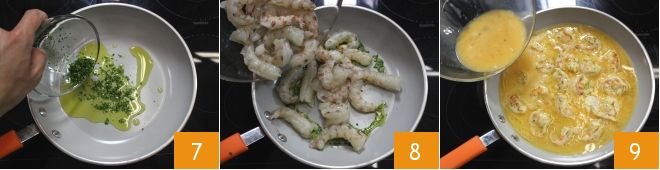 Take a non-stick pan, heat the oil, and pour in the chopped garlic, parsley, and shallot 7 and sauté for a few seconds. Add the cleaned and shelled prawns to the sauté 8 and let them brown over medium heat for about 5 minutes until they are slightly pink. After this time, add the beaten eggs to the pan 9, tilting the pan to ensure the mixture covers the entire surface of the skillet.